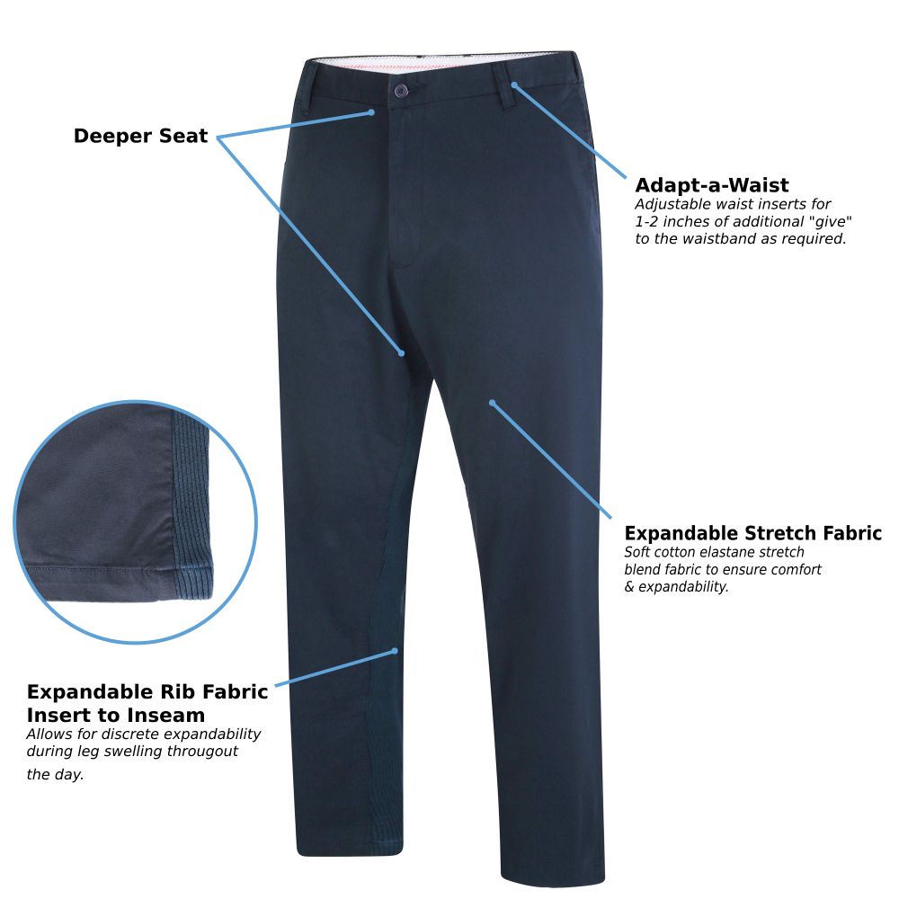 • Expandable Ribbed Fabric Inseam: Each inside leg inseam has a ribbed cotton elastane fabric panel which allows for discrete expandability for swelling throughout the day.